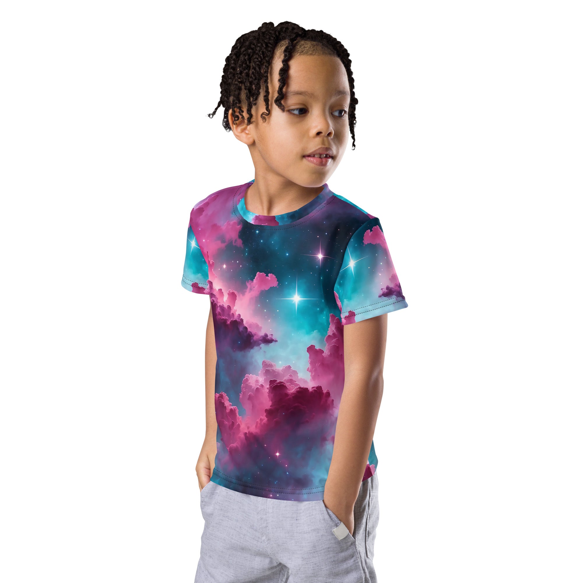 Crafted from the softest, cloud-light fabric, this t-shirt feels like a gentle hug from a friendly breeze. Its crew neck design is perfect for freedom of movement, letting kids climb, run, and conquer their day in comfort. Each thread seems to carry a sprinkle of stardust, making it as special as the little dreamers who wear it.