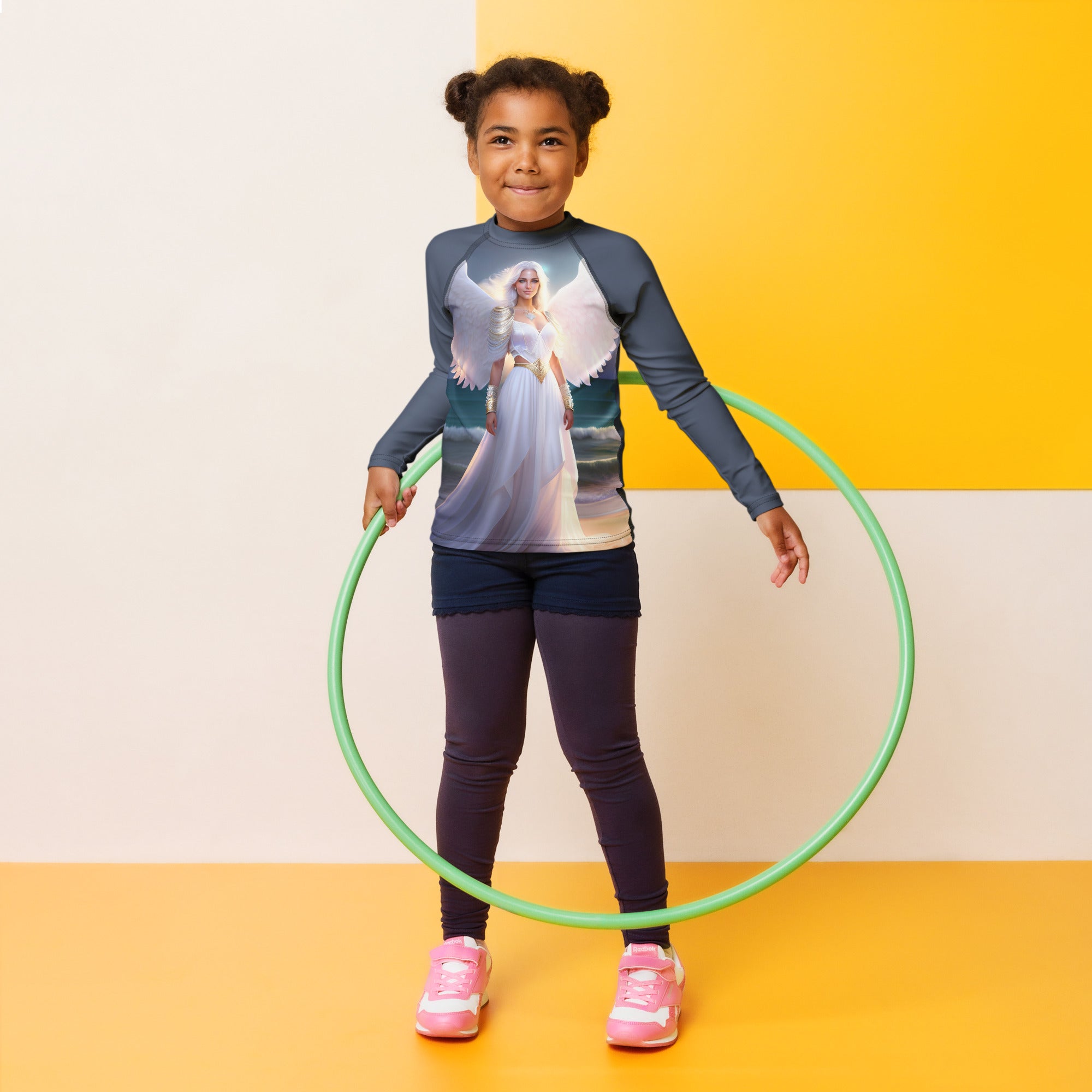 Picture them running along golden shores, splashing through enchanted waves, or racing under the brilliant sun. This rash guard becomes their loyal armor, crafted with sun-protective fabric that feels as light as a whisper yet holds the strength of a guardian. It offers a magical barrier against the sun’s warm embrace, so they can roam freely, from the first light of dawn to the dreamy hues of twilight.