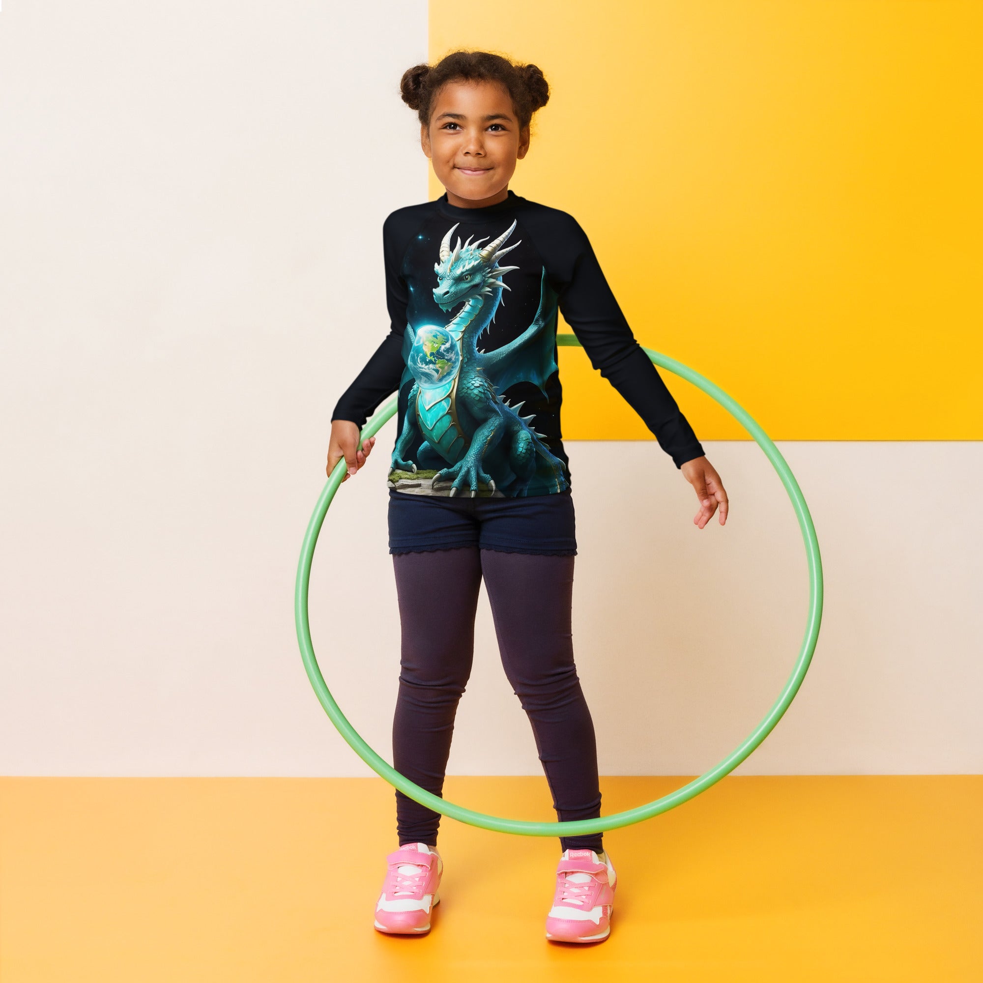 Picture them running along golden shores, splashing through enchanted waves, or racing under the brilliant sun. This rash guard becomes their loyal armor, crafted with sun-protective fabric that feels as light as a whisper yet holds the strength of a guardian. It offers a magical barrier against the sun’s warm embrace, so they can roam freely, from the first light of dawn to the dreamy hues of twilight.