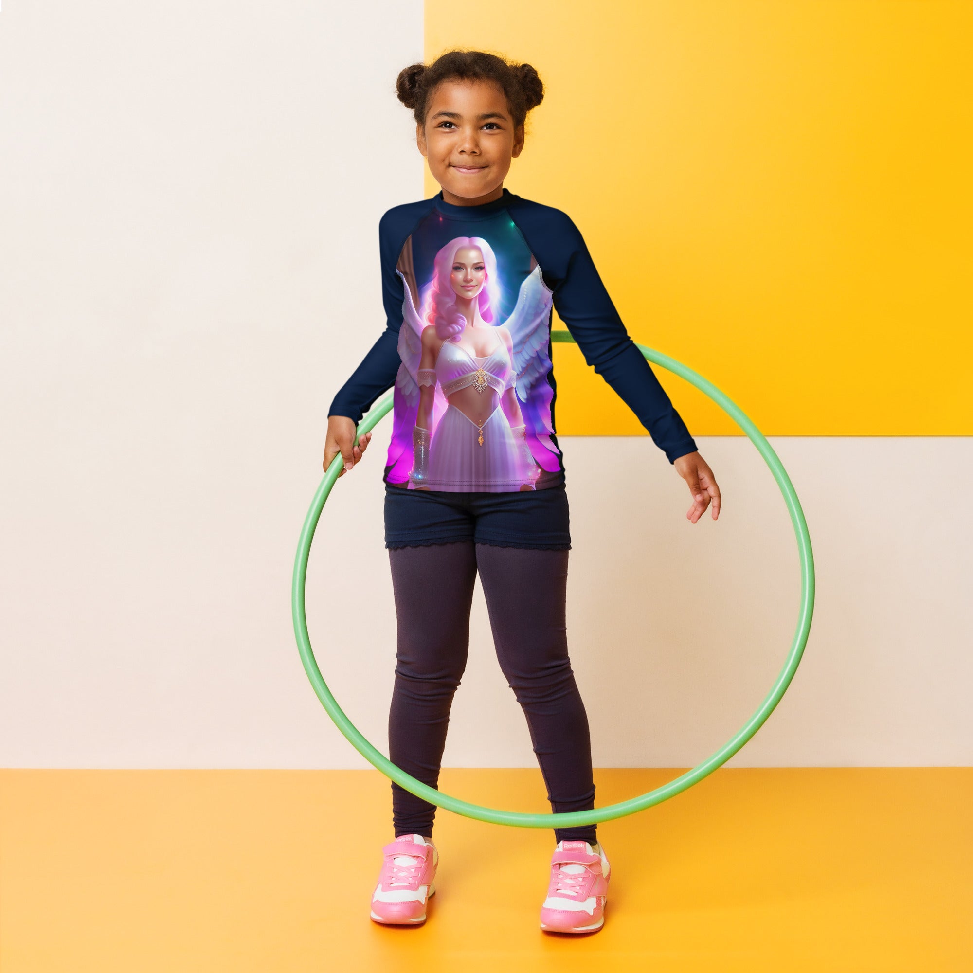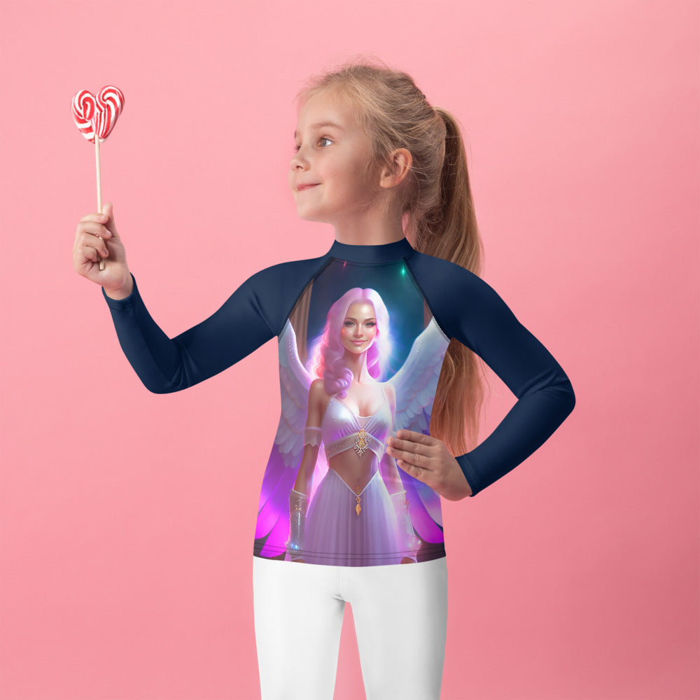 Picture them running along golden shores, splashing through enchanted waves, or racing under the brilliant sun. This rash guard becomes their loyal armor, crafted with sun-protective fabric that feels as light as a whisper yet holds the strength of a guardian. It offers a magical barrier against the sun’s warm embrace, so they can roam freely, from the first light of dawn to the dreamy hues of twilight.