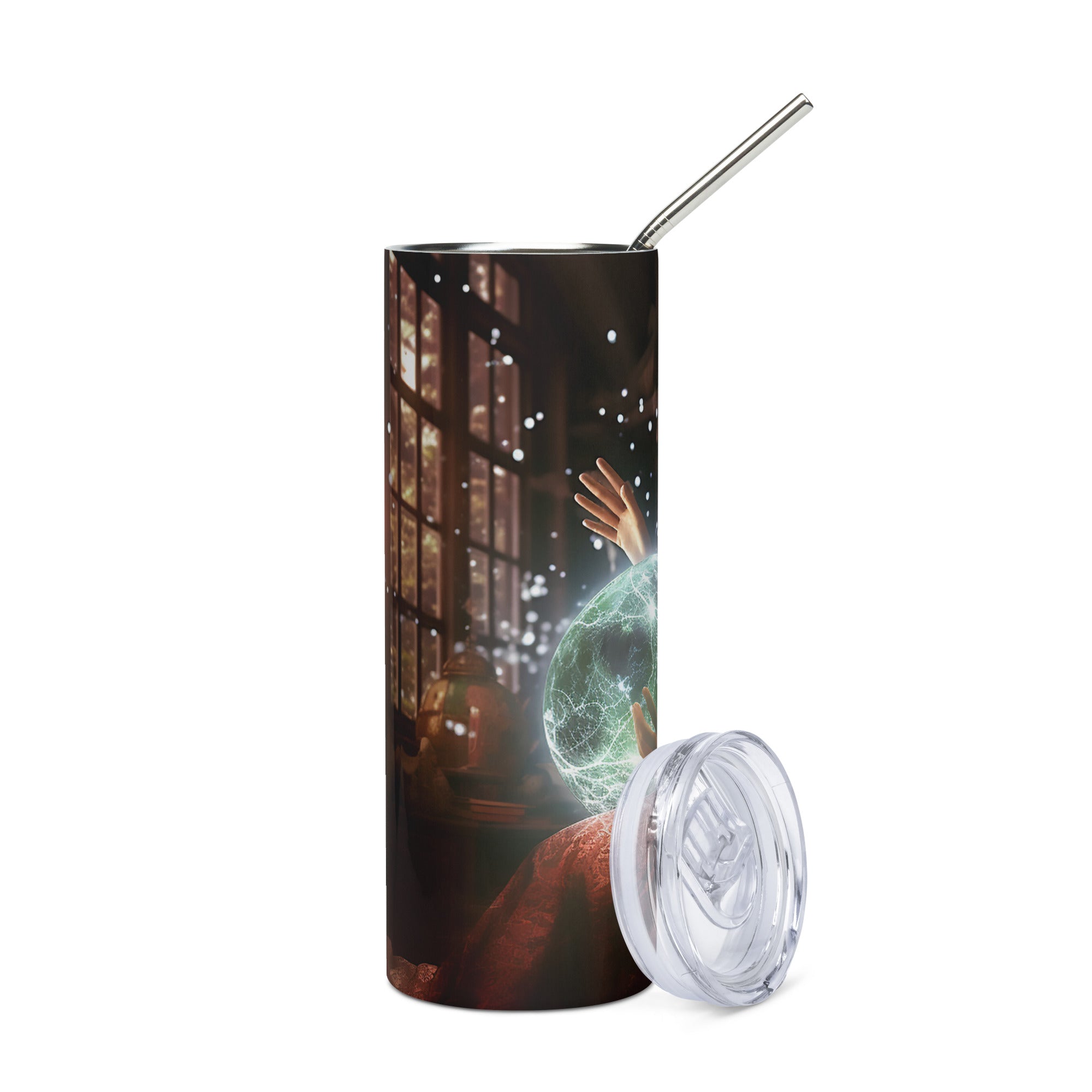 Every detail of this tumbler is crafted to merge elegance with functionality – as if forged in a magical workshop where metal meets dreams. The straw that comes with it is like a delicate silver bridge, carrying your favorite drink with just the right balance of warmth or coolness, as your heart desires.