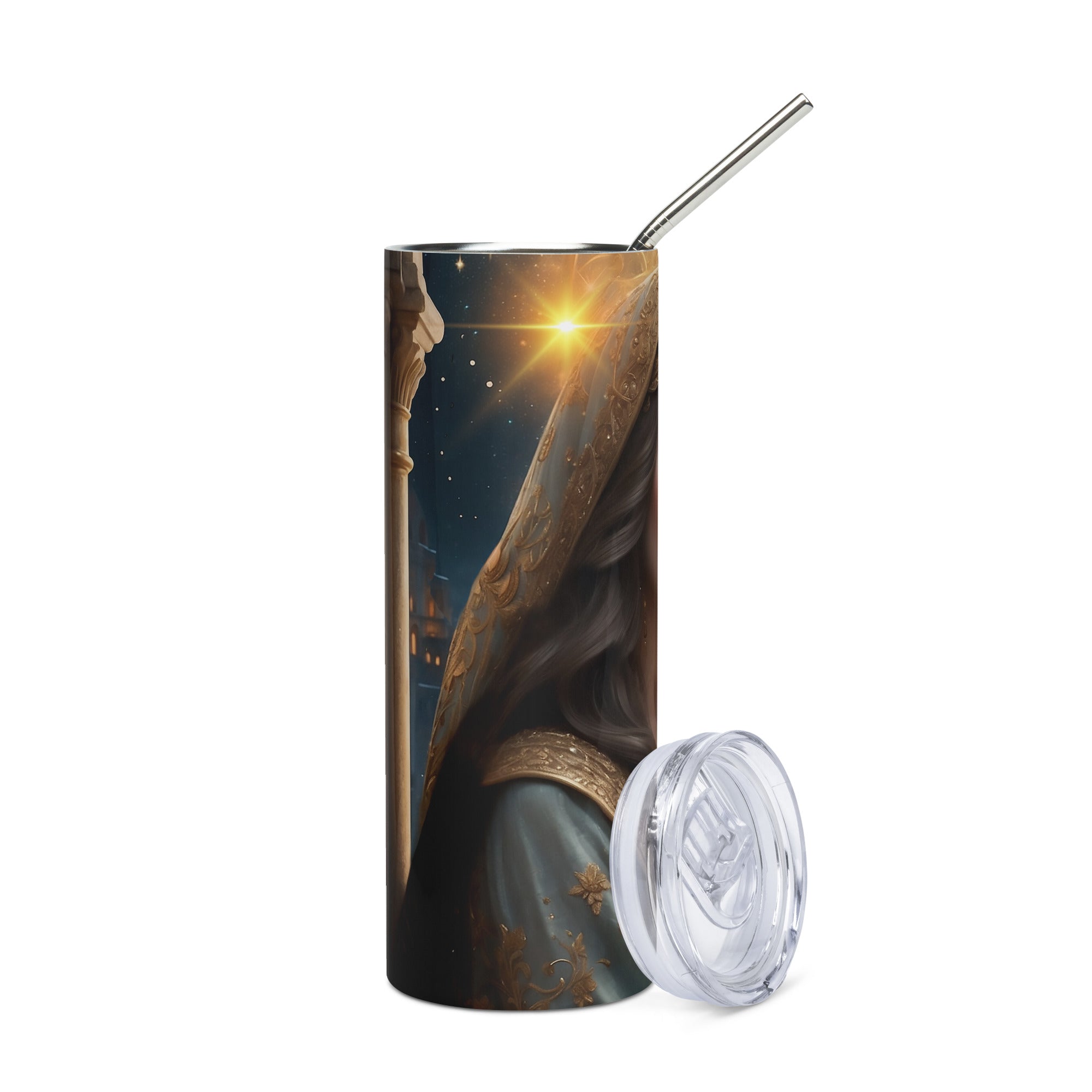 Every detail of this tumbler is crafted to merge elegance with functionality – as if forged in a magical workshop where metal meets dreams. The straw that comes with it is like a delicate silver bridge, carrying your favorite drink with just the right balance of warmth or coolness, as your heart desires.
