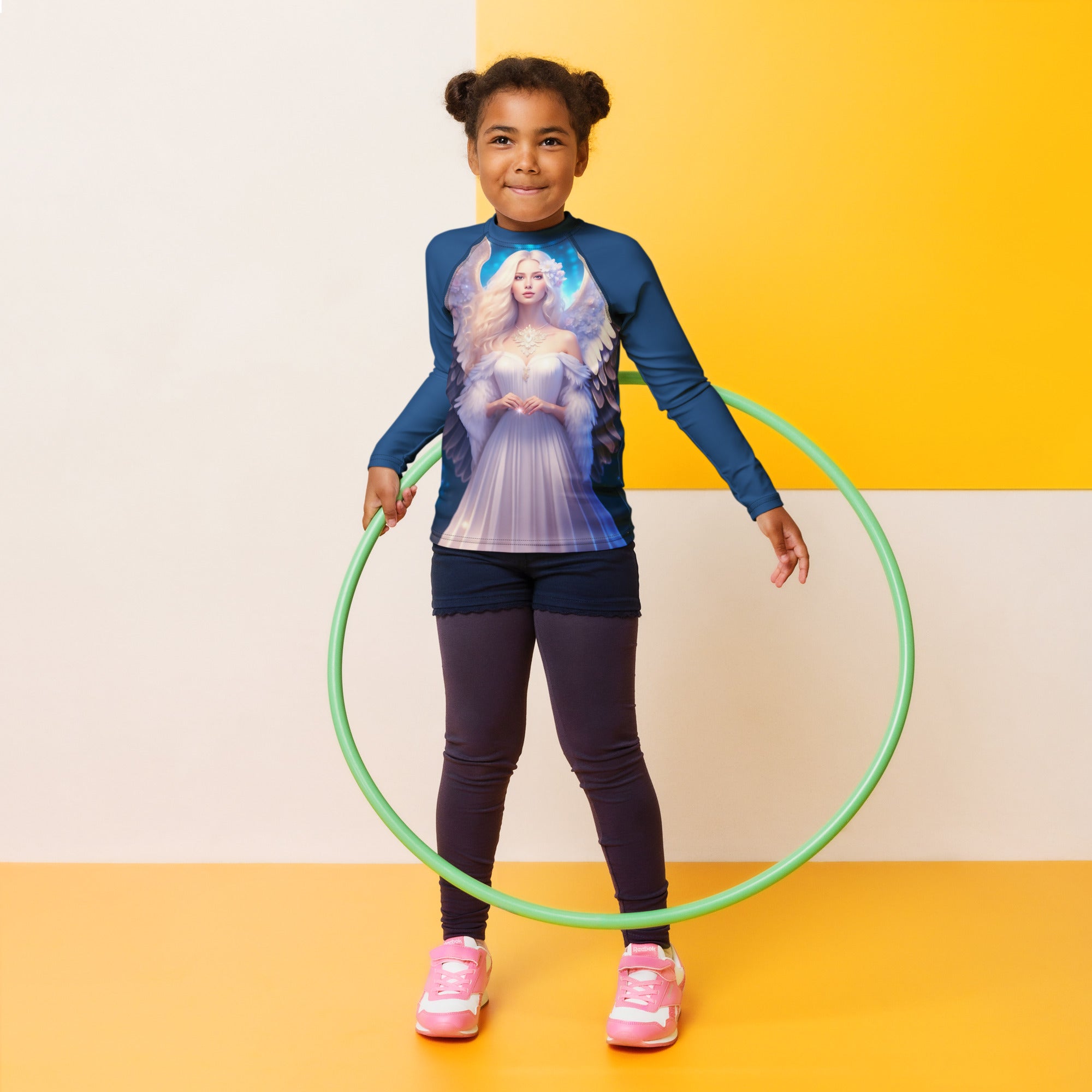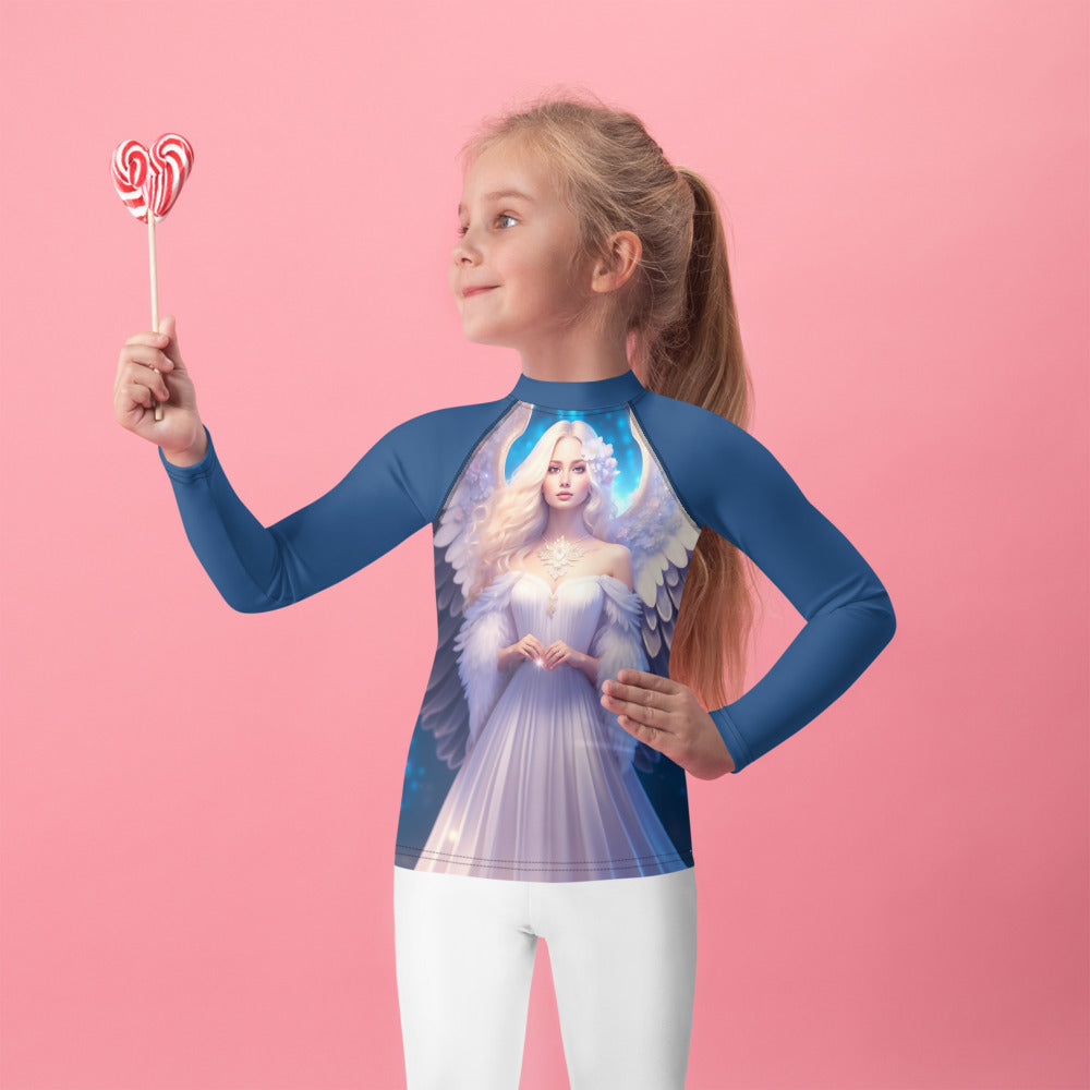 Picture them running along golden shores, splashing through enchanted waves, or racing under the brilliant sun. This rash guard becomes their loyal armor, crafted with sun-protective fabric that feels as light as a whisper yet holds the strength of a guardian. It offers a magical barrier against the sun’s warm embrace, so they can roam freely, from the first light of dawn to the dreamy hues of twilight.